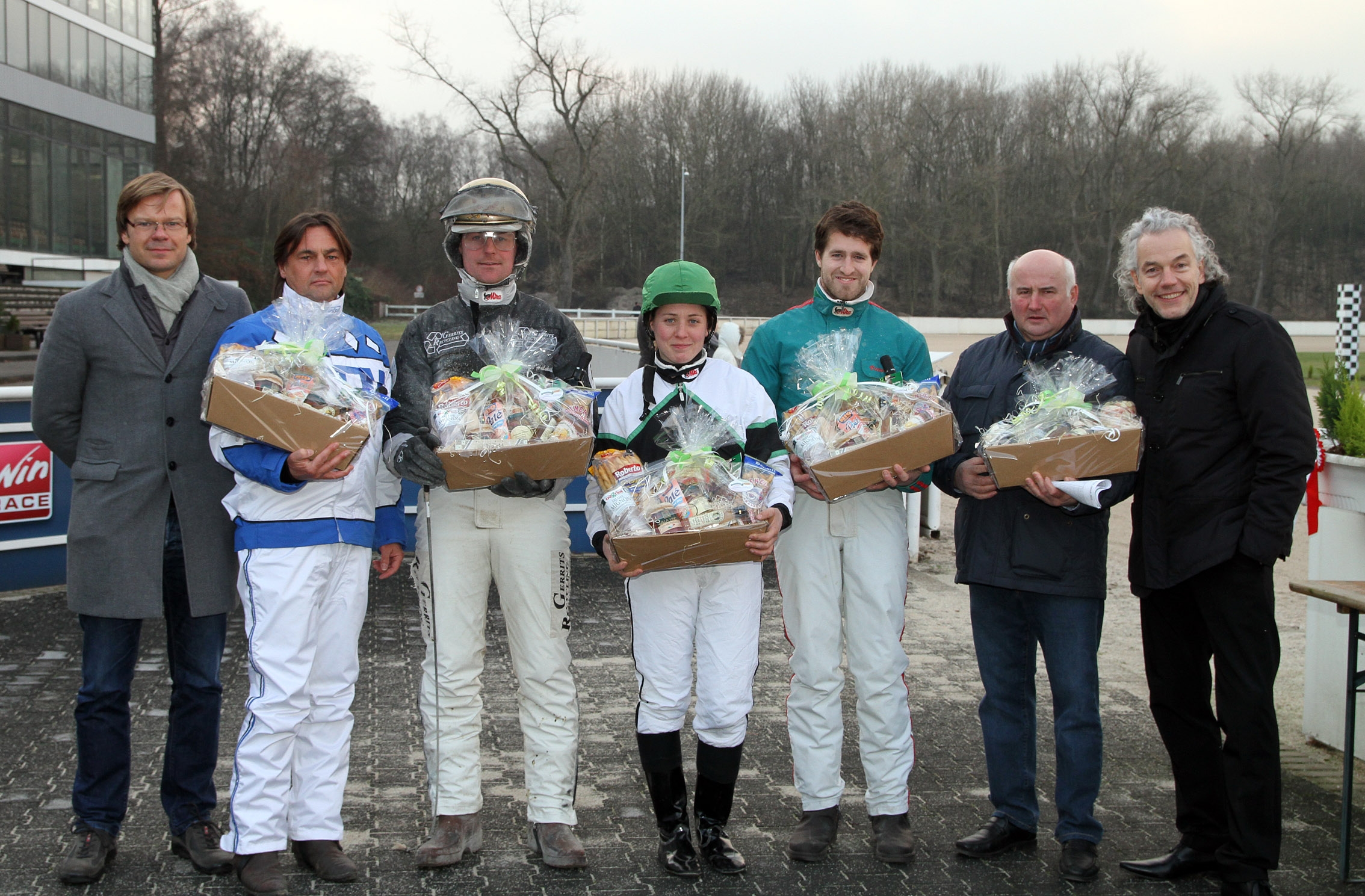 Markus Seidl und Uwe Küster gratulierten den Gelsentrab-Champions 2012 und überreichten im Winner Circle zudem Präsente an: Jörg Hafer (bester Amateurfahrer), Roland Hülskath (erfolgreichster Profi), Silvia Raspe (siegreichste Trabreiterin), Victor Gentz (bester Lehrling) und Gerd Holtermann, Gelsenkirchener Bahn-Champion bei den Trainern.