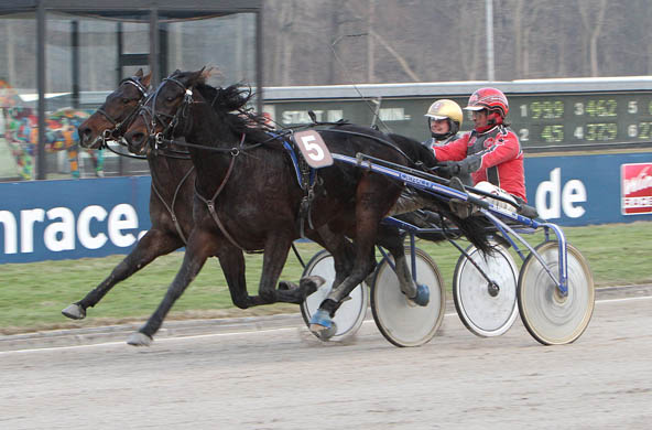Damit konnte man eigentlich nicht rechnen: Im Gelsenkirchener Hauptrennen am Sonntag Nachmittag triumphierten nicht die starken Gäste aus den Niederlanden, am Ende hatte mit der von Thomas Panschow gefahrenen El Conchita eine Lokalmatadorin die Nase vorne. Die kam nach einem für sie perfekten Rennverlauf mit klarem Vorsprung vor dem Großverdiener Unforgettable ins Ziel, der seine 50-Meter-Zulage freilich mit grandiosem Schlusseinsatz nahezu komplett wett machen konnte.
