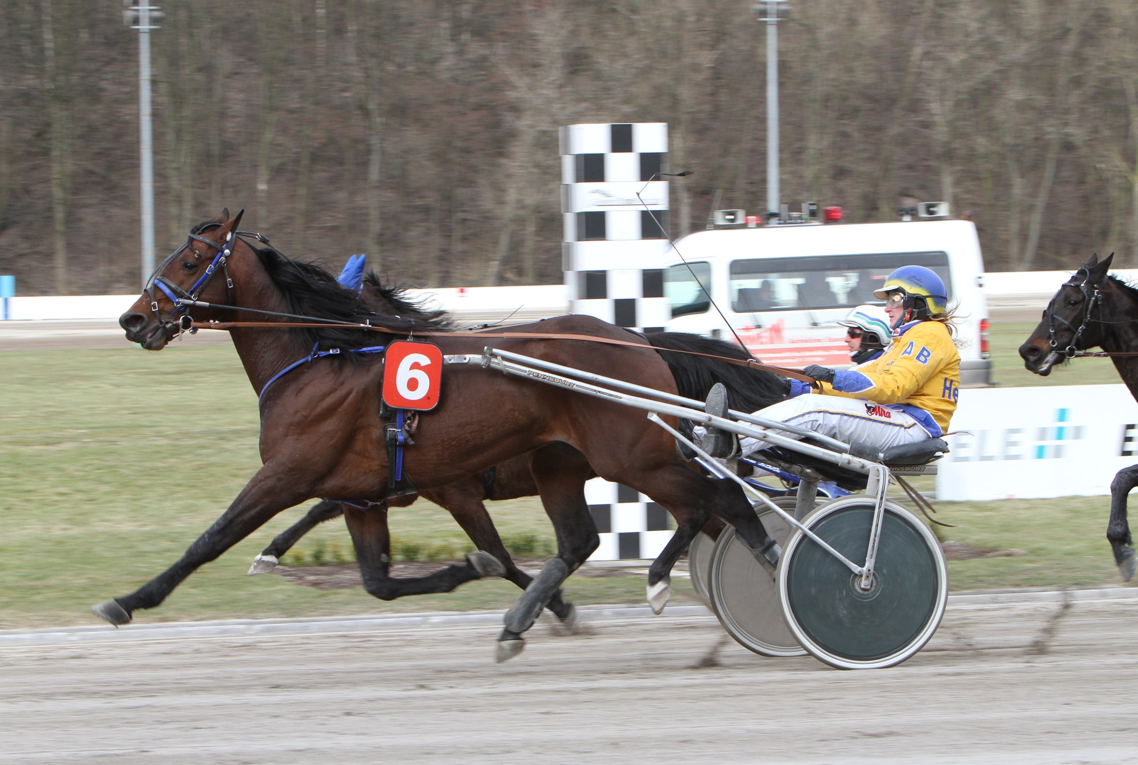 Dort nämlich löste sich Hollys Boy, der bereits eingangs der Schlussrunde das Kommando übernommen hatte, gerade von seinen Verfolgern. Im Sulky von Zidane Boshoeve ließ sich Anke Börnig aber nicht aus der Ruhe bringen. Zwar schritt die Amazone mit dem Crack von Trainer Marcel Hauber zur Tat, doch waren noch vier Konkurrenten vor ihr.